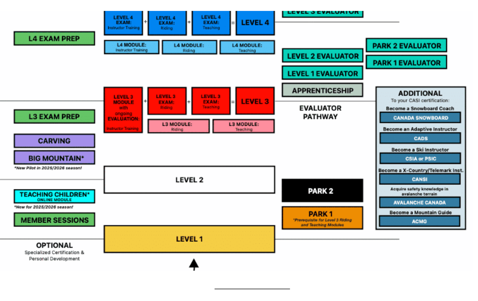 • Freestyle (Park) Evaluation: Now part of the Riding exam; focuses on confident Park 1-level skills (refinement level). *Consult Level 3 Riding module and Park 1 course guides for more details.